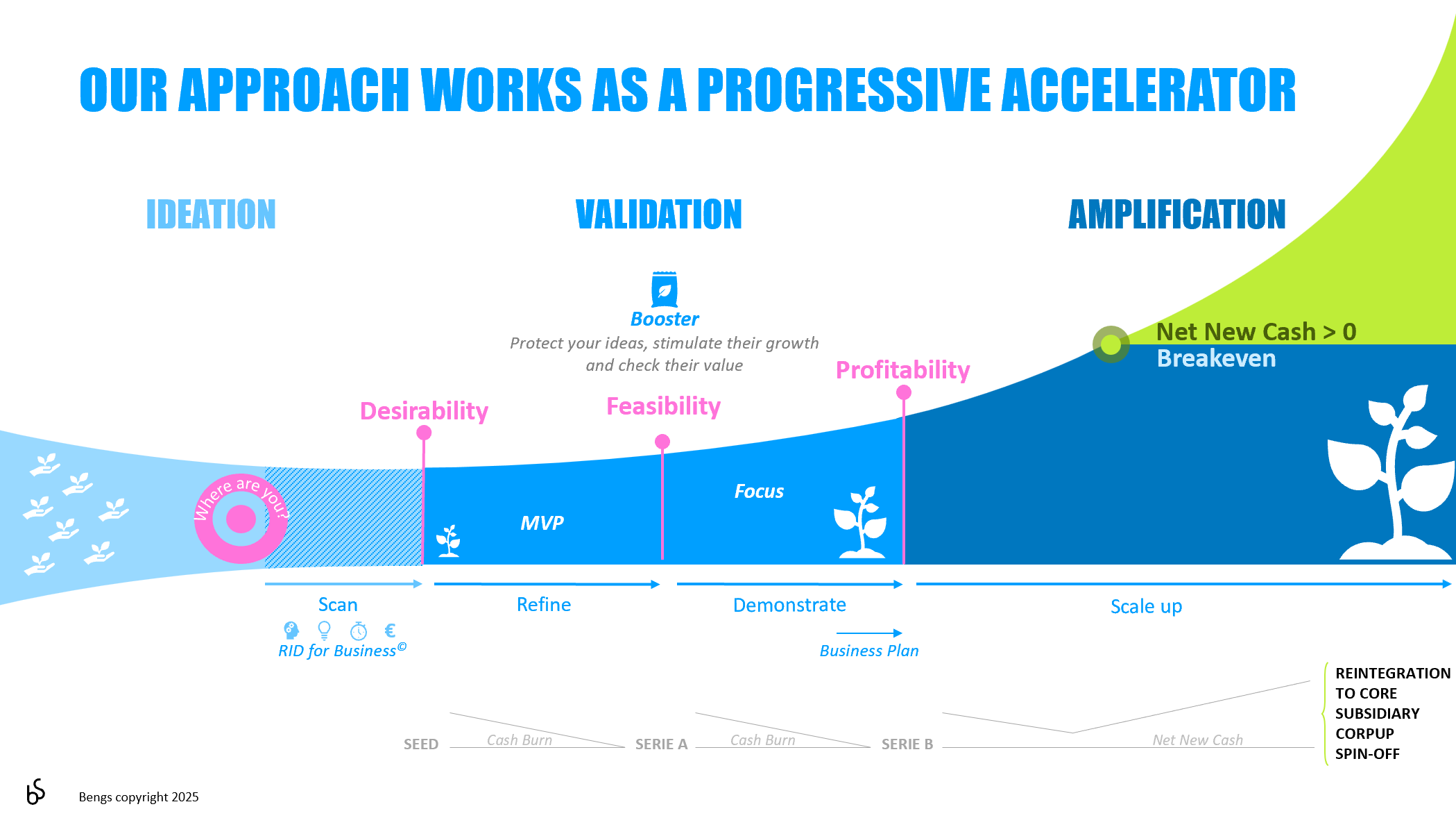 De manière temporaire ou plus pérenne, nous montons pour vous une structure de Start-up Studio pour vous aider à créer des business models en série. Notre approche repose sur un processus d’innovation clé en main de 12 semaines, conçu pour faire émerger rapidement des innovations disruptives sur le marché. Elle s’appuie sur la méthodologie Radical Innovation Design for Business, co-développée avec CentraleSupélec, et a démontré son efficacité en transformant des intuitions en opportunités business. À ce jour, une douzaine de Corp-ups ayant généré + de 350M€ ont été lancées avec des grands groupes.